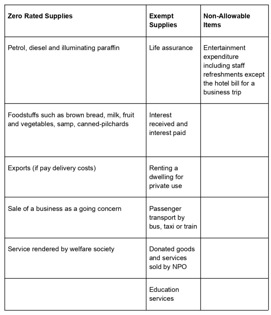 Exempt supplies are not subject to VAT. No output VAT, either at 14% or at 0%, is levied on exempt supplies. Input VAT incurred on expenses to make exempt supplies cannot be claimed against output VAT due to SARS.